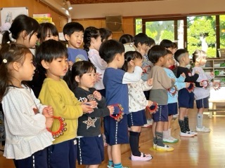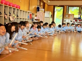 音楽に合わせて楽器を鳴らしたり、先生の歌をよく聞いて、それに合わせて楽器を鳴ら
