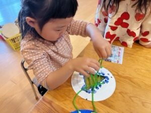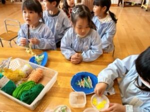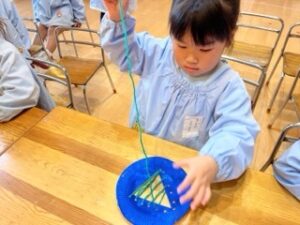 一穴ずつ、次はどこに毛糸を通すのか考えながら行う子ども達。