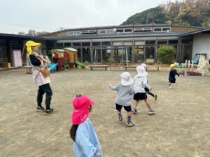 今日は空が暗く、少し雨が降る時間帯もありましたが、今日1番初めに園庭に出てきた