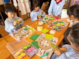 年中組のクラスでは、クリスマスを楽しみに、クリスマスの飾りを作っていました🎵
