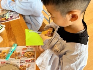 ①グリーンの部分は、画用紙に書いてある丸い形の線にそって、ハサミを使って自分で