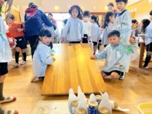 ボールを坂に転がしてピンを倒すゲームですが、お客さんにボールを渡したり、ピンが
