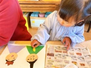 年少組は自分で位置を考えながら、いちご組は先生と一緒に貼っていました!