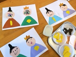 初めにお雛様とお内裏様の着物を好きな色を選び、自分でノリを使って台紙に貼りま