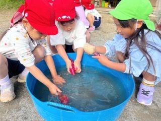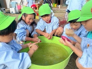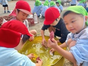 お友達と形や大きさを比べたり、キレイになったか見せ合ったりしながら、楽しんで洗