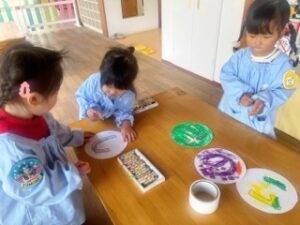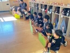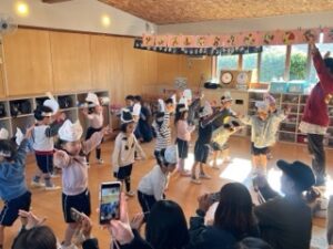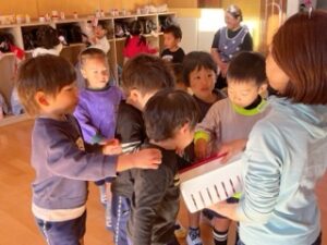 続いて、『園歌』をったり、『きのこ』の曲に合わせて楽器遊びをしました。