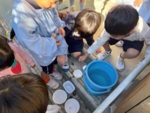 一昨日から氷を作ろうとバケツに水を張っていたもも組さんですが、昨日は凍っていな