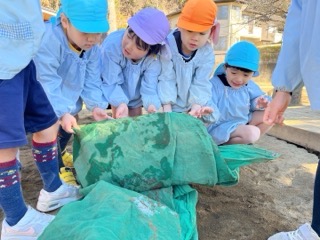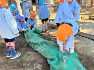 年長さんがいつものように砂場当番を始めると、砂場や覆っていたシートまで凍ってい