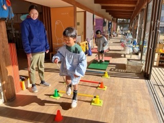 斜面を歩くことや、障害物をまたいで歩いたり、まっすぐではなくジグザグにクネクネ