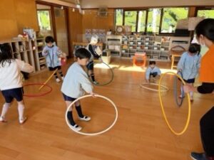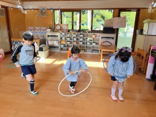 フラフープを今までやっていたように電車に見立てて遊んだり、中に入ってお家のよう
