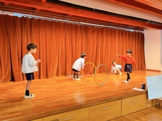 フラフープを腰で回すのは大技ですが、その他にも地面に立てて手で回す技や、フープ