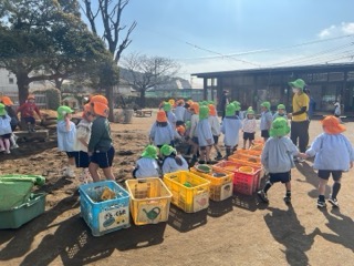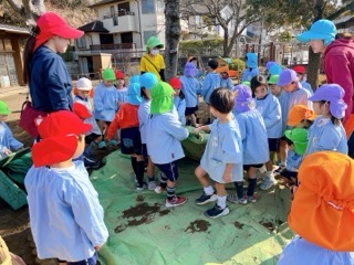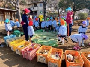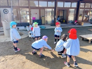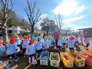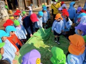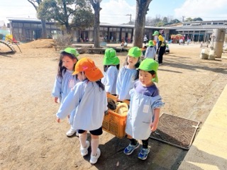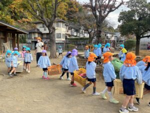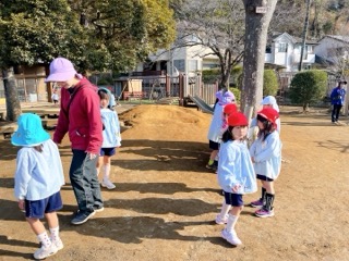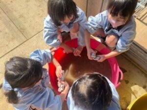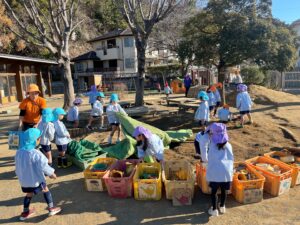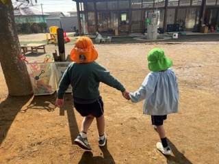 朝と帰りのやり方が違うので、まずは朝、年長組の皆が年中組を誘って一緒に砂場当番