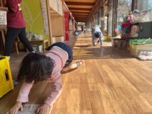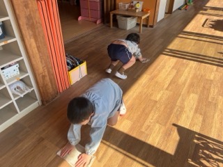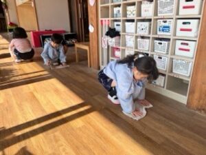 その頃うぐいす組は、園内の廊下を雑巾がけして、幼稚園中をキレイにしてくれていま