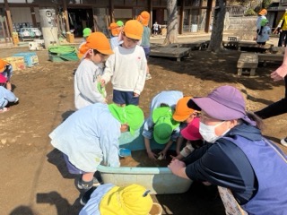 道具が入ったカゴを一緒に運んで並べ方を教えたり、タライの水のため方や砂場シート