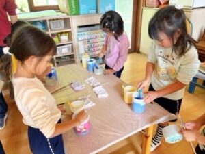 友達同士で見せ合いながら、実際に絵の具を混ぜて作ってみました!