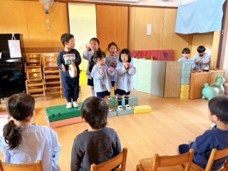 水族館のショーや音楽隊、フラフープやポックリの真似っこ等、年長・年中さんがやっ
