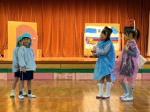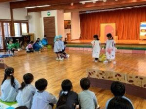 先週、年長組が学年で劇を見せ合っていましたが、今日はつばめ組の番でした!