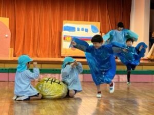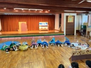 つばめ組の劇は、子ども・妖精・オバケ・カッパ・トリが出てくるメロンパンのお話で