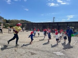 集会の後は、クラスの皆でドッジボール、うんてい、アリンコ遊びや、砂場でダイナミ