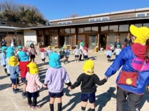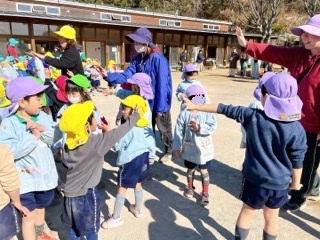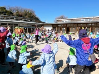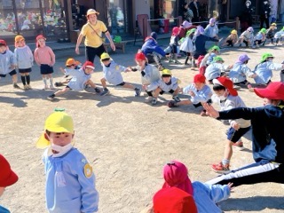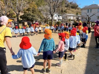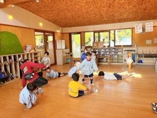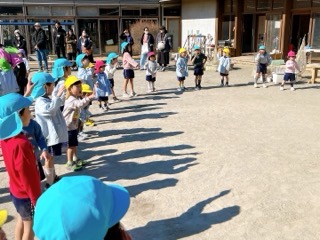 今日は、皆で手を繋いで丸くなった時に、円が小さくて中に入れずに後ろにいる年少