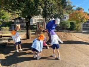 放送を聞くとさすが年長さん、すぐにその場で身を低く、体を丸めて「ダンゴムシ」