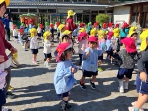 防災頭巾をかぶり、点呼をし、園長先生の話を聞きました。
