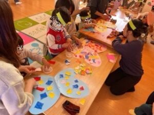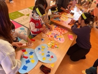 自分の好きな色の羽にのりを使ってカラフルな模様をつけました🌷