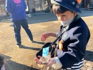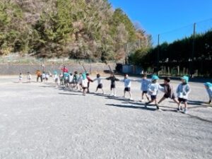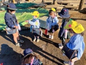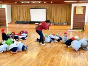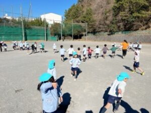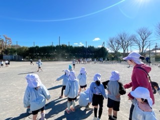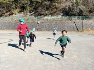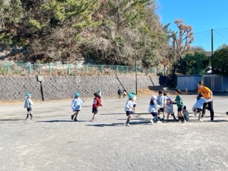 3学期になり、園庭で楽しんでいる「グーチョキパー星人」の鬼遊びを、学年全員で遊
