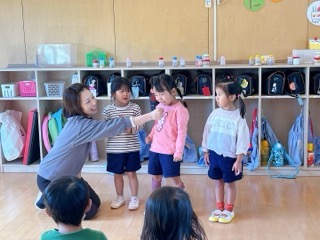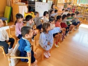 みどり組には11月生まれのお友達がいないため、今月の誕生会はあお組もも組が行