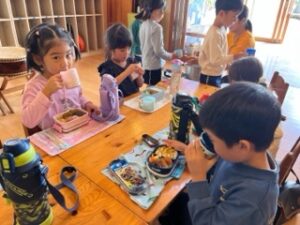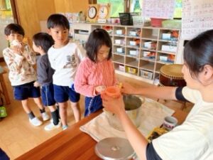 年長組は、先週畑に行った際に間引きしたダイコンの味噌汁を、お弁当の時間に食べま