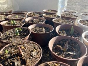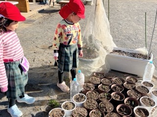2学期に自分達が植えたちゅうりっぷの芽が大きくなっているのを発見して、喜ぶ年中