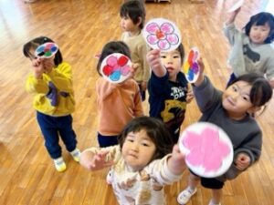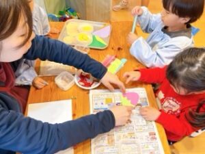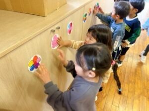 卒園する年長組に向けて年中組が相談し、コサージュのプレゼントをすることを決めま