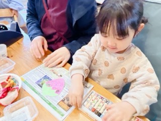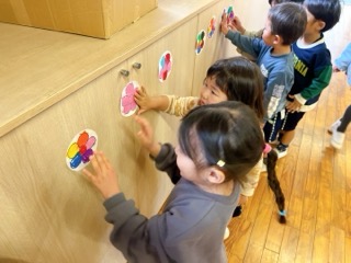 飾りを、年少・いちご組は花に色を付けて飾ることにしました♥️