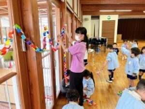 そうと決まったら、年長さんがいない間に会場を飾りつけしちゃおう!と、年中組は輪