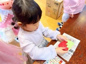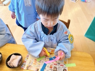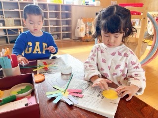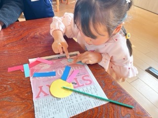 年少組は、自分で花びらの色を決め、半分に折って花びらを自分で切って、ノリで貼っ