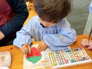 いちご組は、いちごのヘタを自分でノリを使っていちごに貼り、いちごの粒々をクレヨ
