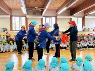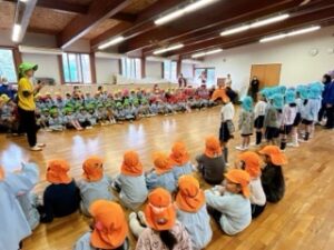 そこへ何も知らない年長さんがいつもの月曜集会のつもりでやってきました!