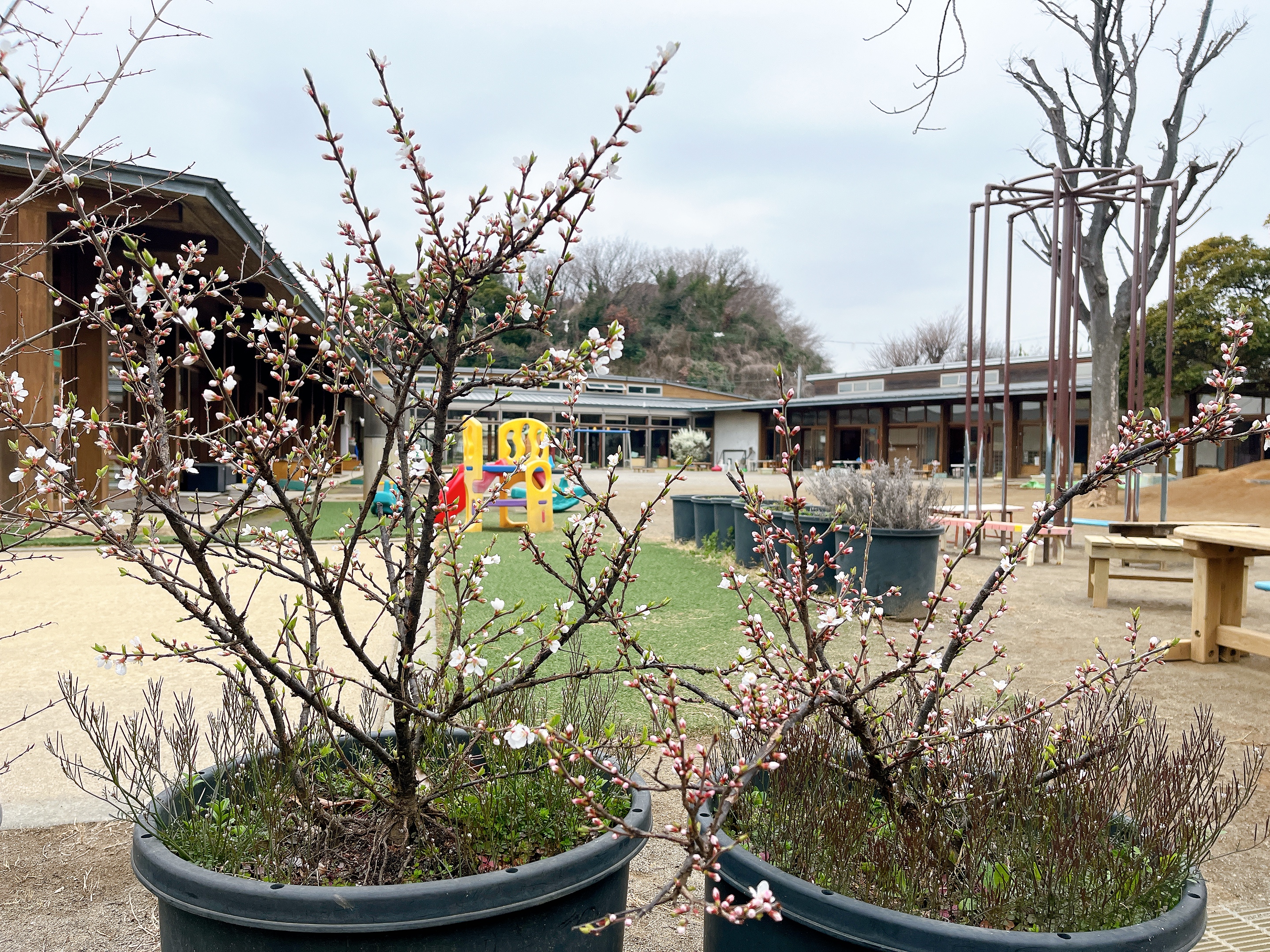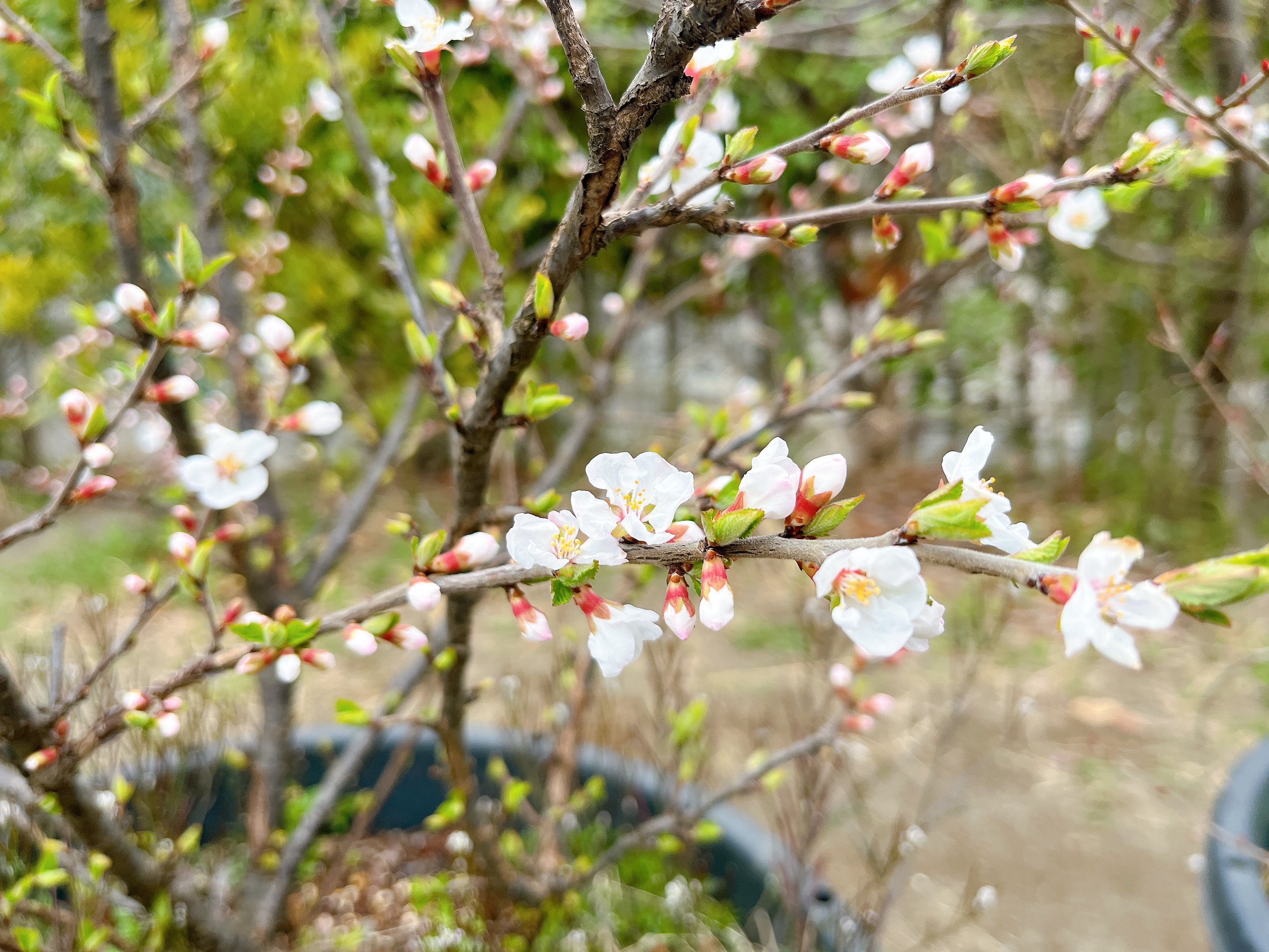 園庭のユスラ梅のつぼみが開き、花が咲き始めました。