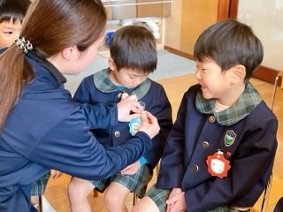 他のクラスの子が同じバッチを付けているのを見て、「一緒だね!」と、喜ぶ姿もあり