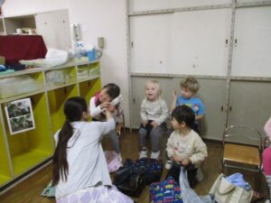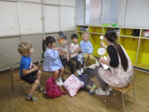 「大好き!」と言ってウサギさんとハグや握手、名前を呼ばれてお返事…お集りの時間も毎日のお楽しみとなっています。友達の嬉しい表情を見て、みんなもニコニコ…友達の気持ちをそばで感じる大切な場面でもあります。