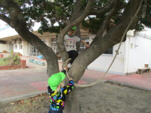 園庭のあちこちに落ち葉が舞っています。先生たちの真似をして落ち葉のお掃除が毎日の遊びになっています。他学年の友達を真似て、木登りをしたりロープで遊んだり…やってみたいことがたくさんの満3歳児です。