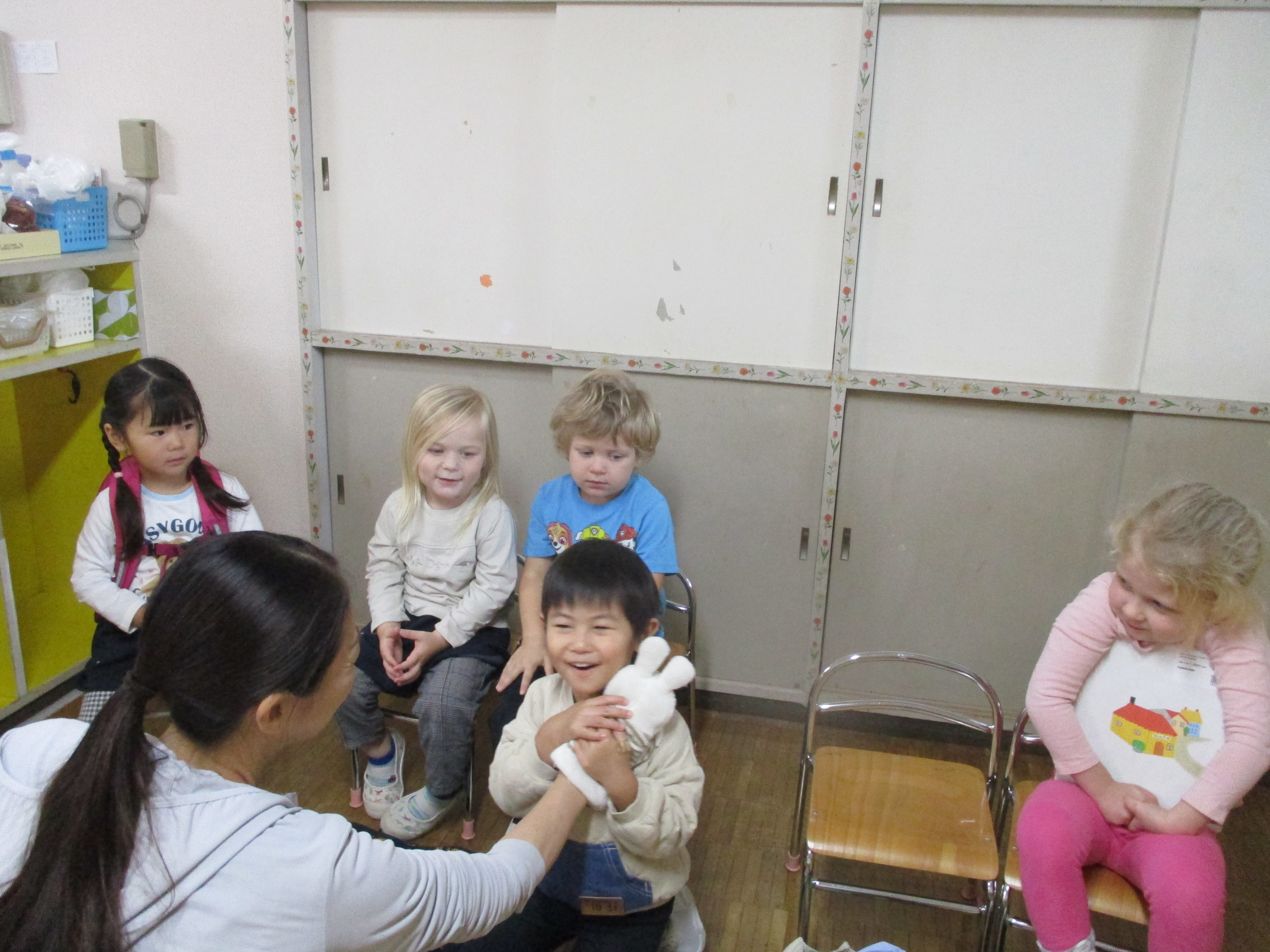 「大好き!」と言ってウサギさんとハグや握手、名前を呼ばれてお返事…お集りの時間も毎日のお楽しみとなっています。友達の嬉しい表情を見て、みんなもニコニコ…友達の気持ちをそばで感じる大切な場面でもあります。