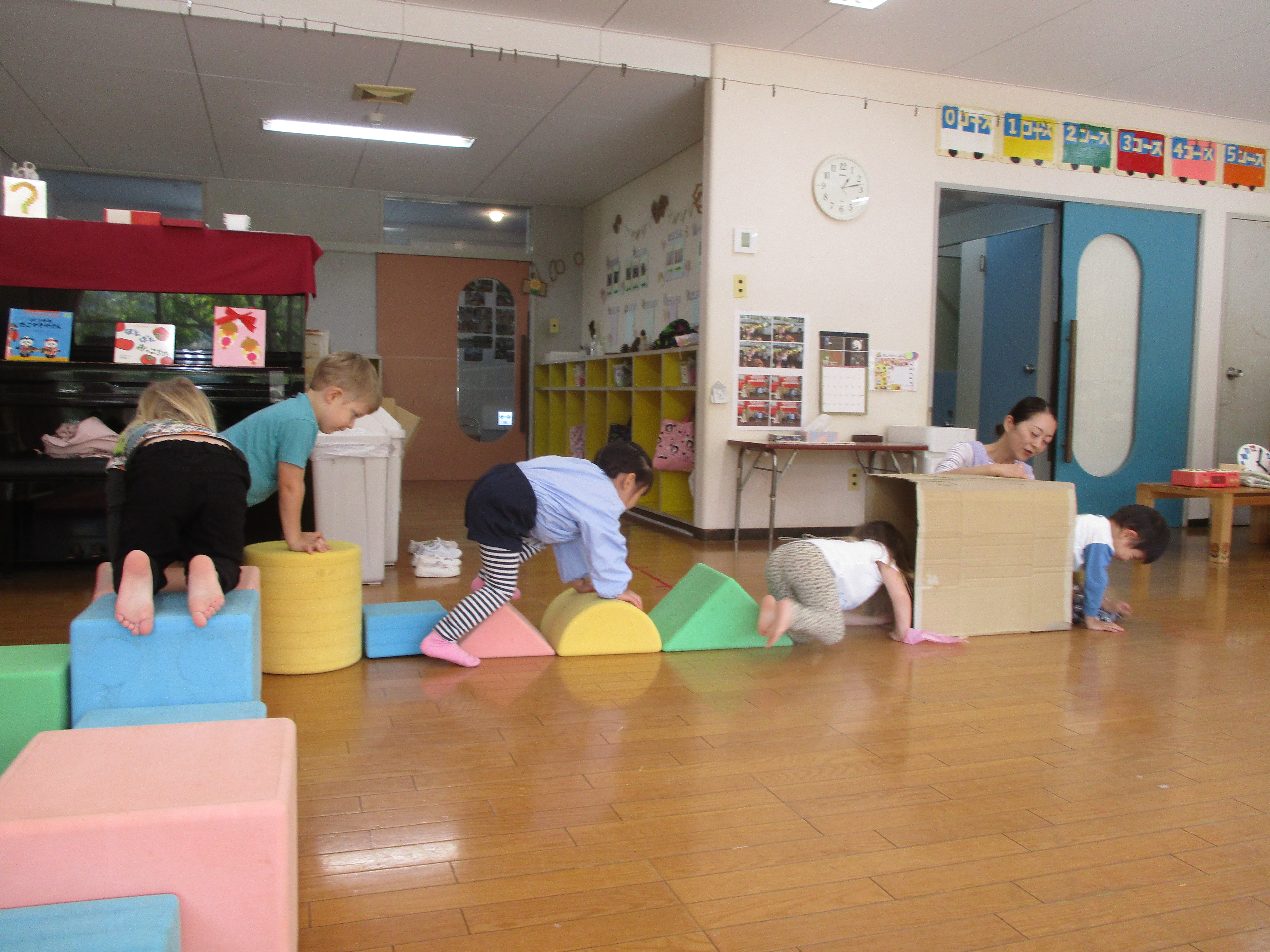 「ニャー、ニャー」「ニャン!」ネコちゃんたちがソフトブロックから落ちないようにゆっくり進みます。トンネルを通ると先生とこんにちは!!