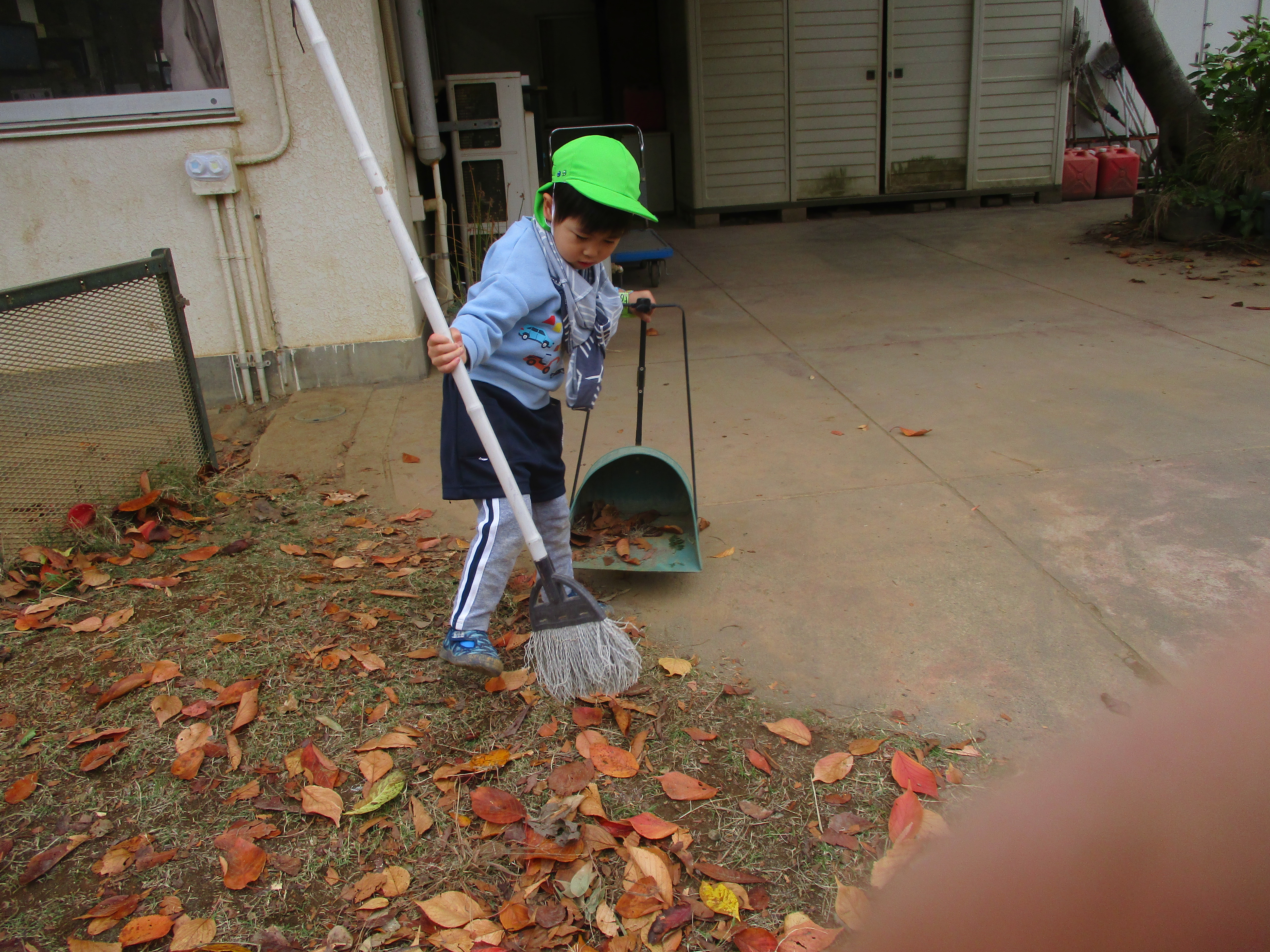 園庭のあちこちに落ち葉が舞っています。先生たちの真似をして落ち葉のお掃除が毎日の遊びになっています。他学年の友達を真似て、木登りをしたりロープで遊んだり…やってみたいことがたくさんの満3歳児です。