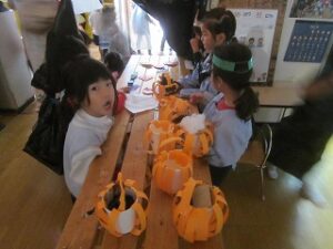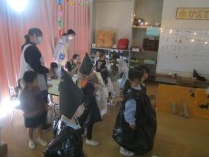 帰る時には、一人ずつお土産をもらいました。「お菓子美味しかった!」「おばけ優しかったね。」「私も魔女になりたい。」午後は、お姉さんたちを真似て早速コスチュームを作る子どももいました。今日のハロウィンパーティーでは運動会後、またひとつ成長した年長組の姿と異年齢児とかかかわる楽しさ、嬉しさを感じている満3歳・年少・年中児の様子が見られました。