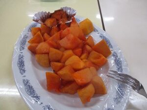 先日収穫したカキを食べました。とても甘く美味しかったです。来週は満3歳児が園庭でミカン狩りを行います。