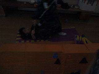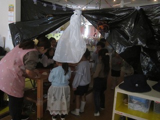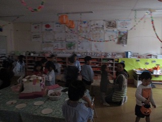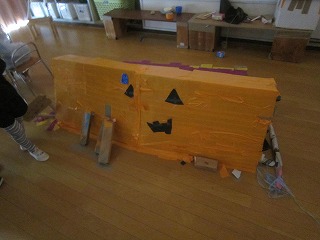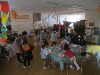 年長組がハロウィンパーティーを開きました。「お菓子がもらえるんだって!」「おばけがいるみたい!」「ハロウィンだから、コスチュームを着ていかなきゃ!」他学年の子どもたちはどんな楽しいことが待っているのかとワクワクして入っていきました。お化けや魔女たちがお出迎えしてくれ、『お菓子コーナー』『魔女の家』『ゾンビの家』『ハロウィンお絵描きコーナー』等、場所、遊び方を教えてくれました。