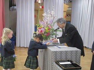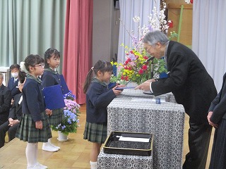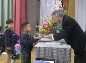 第51回修了式、年長児にとって幼稚園最後の日です。壇上に上がり、園長先生から修了証書を受け取った子どもたちの瞳はキラキラ輝いていました。毎日楽しく通った幼稚園、子どもたちは、遊びを通して多くのことを学び、立派に成長しました。