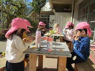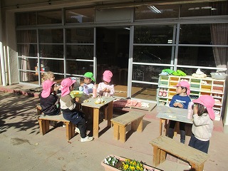 今日も朝から青空がきれいな一日でした。満3歳、年少、年中組は外遊びを楽しみました。