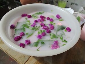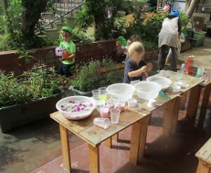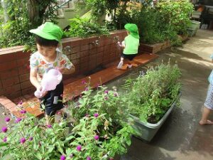 今週、満3歳児は色水遊びに夢中になっています。好きな色を容器に入れたり、色を混ぜたり、今日は草花を入れて遊び始めました。アジサイの大きな葉を契って小さくしたり、センニチコウを浮かべたり…繰り返し遊ぶ中で一人一人の「やってみたい!こうしたい!」の気持ちが大きくなり、新しい遊び方も次々に出てきます。